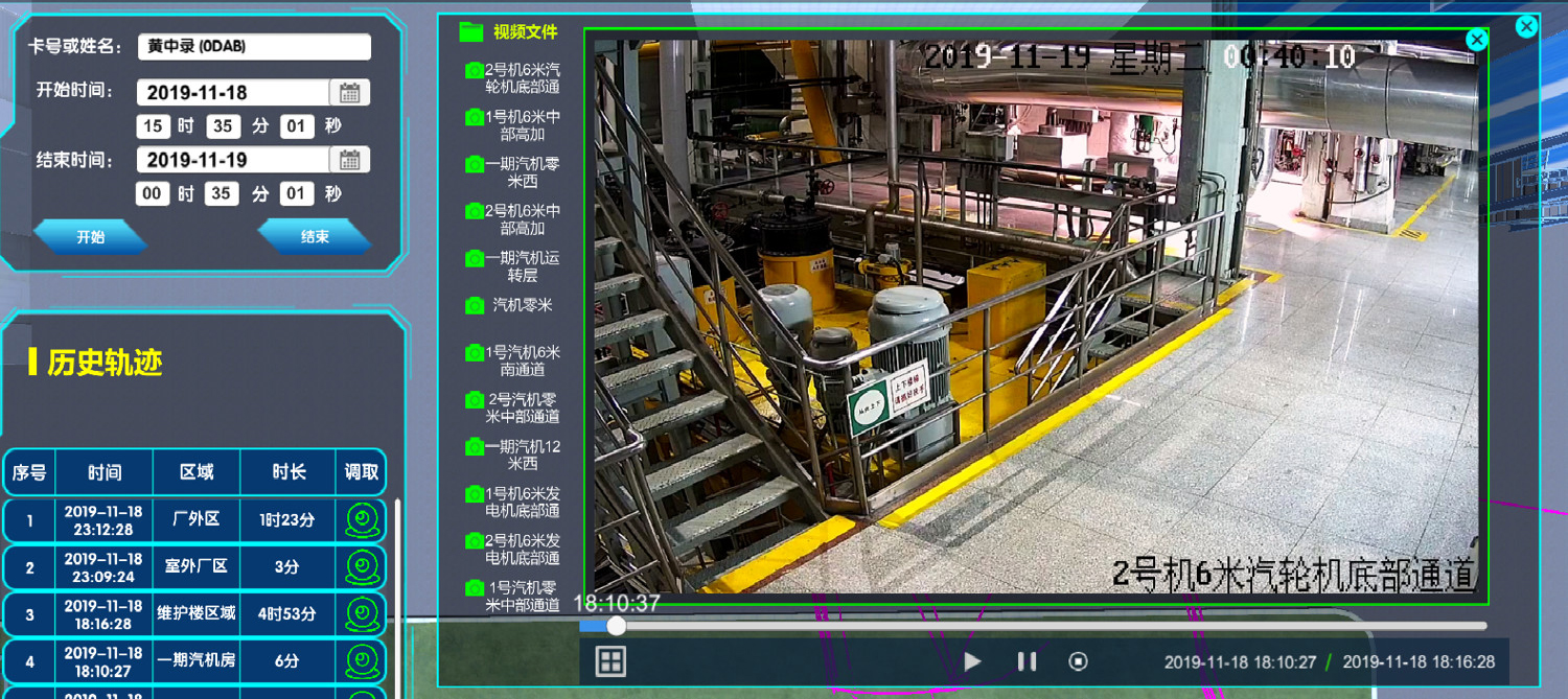 系統(tǒng)支持接入電廠視頻監(jiān)控系統(tǒng),在三維電子地圖上顯示視頻監(jiān)控位置,任意切換調(diào)取視頻監(jiān)控。可實(shí)現(xiàn)快速查找、單點(diǎn)回放、圖像識(shí)別等功能。同時(shí)可基于人員當(dāng)前位置自動(dòng)調(diào)取對(duì)應(yīng)的視頻監(jiān)控,對(duì)人員行走到其他位置自動(dòng)切換到相應(yīng)監(jiān)控畫面。對(duì)于發(fā)生異常的情況,可基于人員歷史軌跡不同位置及不同時(shí)段調(diào)取相應(yīng)位置相應(yīng)時(shí)間段的歷史視頻監(jiān)控,與歷史軌跡聯(lián)動(dòng)播放,方便事故分析及責(zé)任劃定。