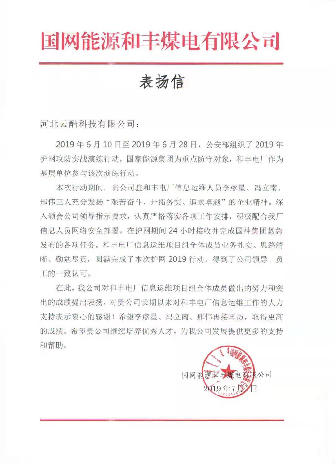 云酷科技運(yùn)維服務(wù)部的四位同事憑借優(yōu)異的技術(shù)實力和敬業(yè)精神,在本次的演練行動中獲得某煤電有限公司的高度贊揚(yáng),并向我司發(fā)來了表揚(yáng)信:
